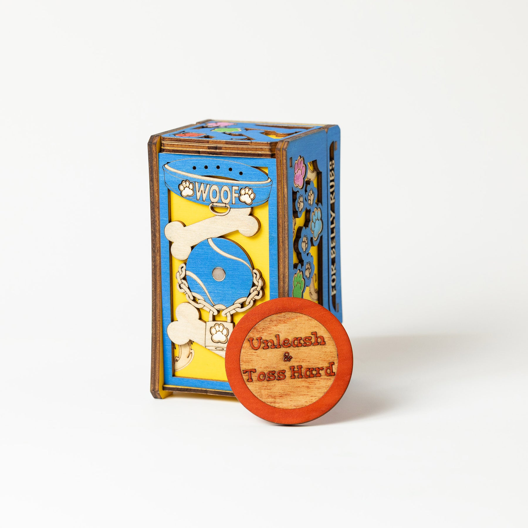 Obedience training not required. This foldable dice tower rocks a bold blue, yellow, and orange color scheme with paw prints, an engraved woof, and a medallion that dares: Unleash and Toss Hard. Lined with plush orange felt for a satisfying roll, it locks up tight with magnetic closure—ready to travel, pack, and play rough wherever your next session leads.