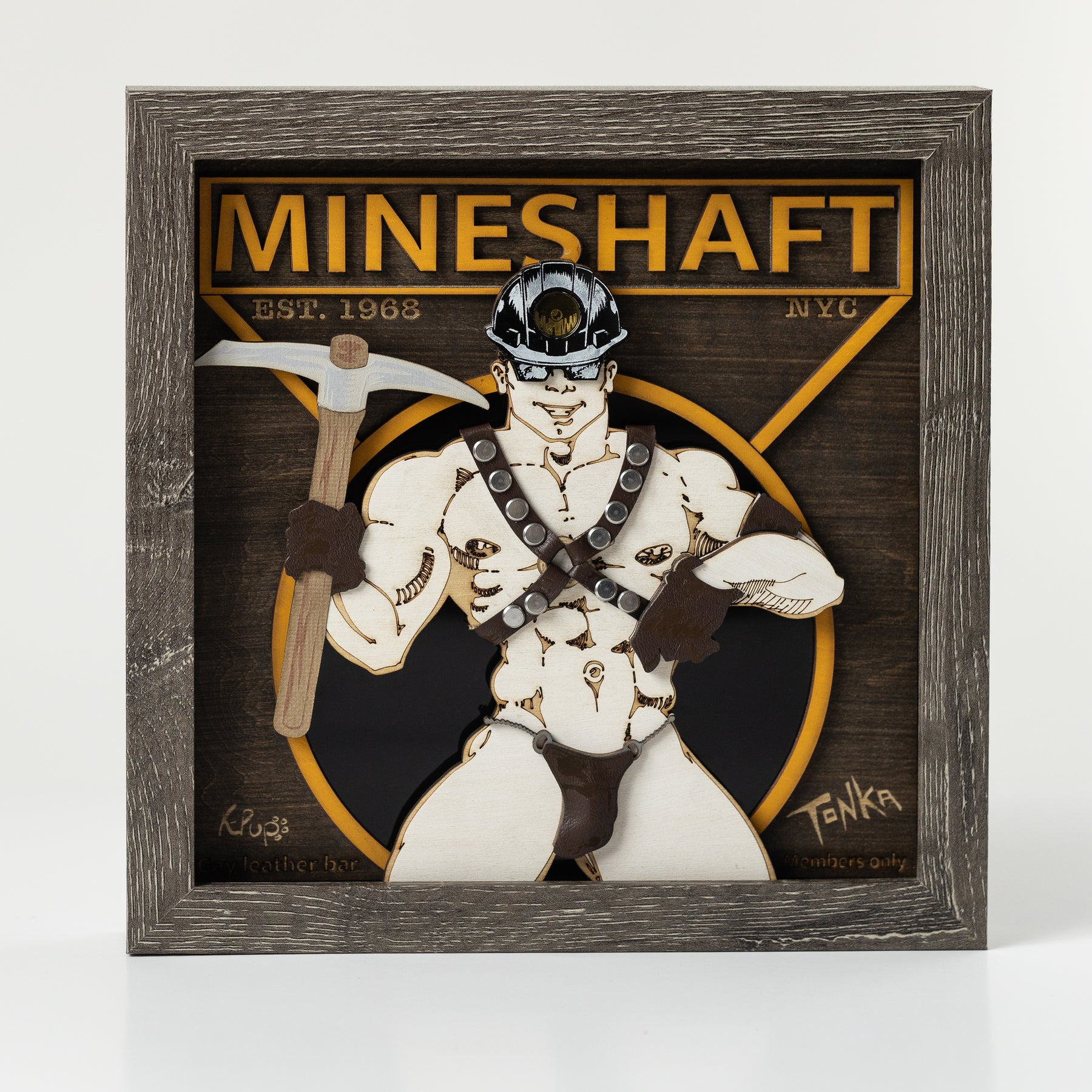 Inspired by NYC's historic Queer Bar and celebrating iconic queer leather culture, Mineshaft Deep Entry Shadowbox blends Tonka Art’s striking character design with QueerCraft engineered K-Pup's unique & immersive multi-dimensional shadow-box craftsmanship.